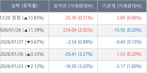 [장중수급포착] 대한광통신, 외국인/기관 동시 순매수… 주가 +13.83%