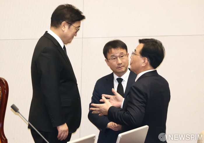 [서울=뉴스핌] 정일구 기자 = 우원식 국회의장과 한병도 더불어민주당 원내대표, 송언석 국민의힘 원내대표가 29일 오후 서울 여의도 국회에서 열린 본회의에서 대화하고 있다. 2026.01.29 mironj19@newspim.com