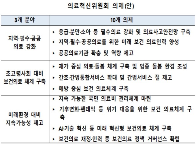 ◆ 의료개혁 안건 3개 분야·10개 의제 압축…지필공·초고령 사회·지속성