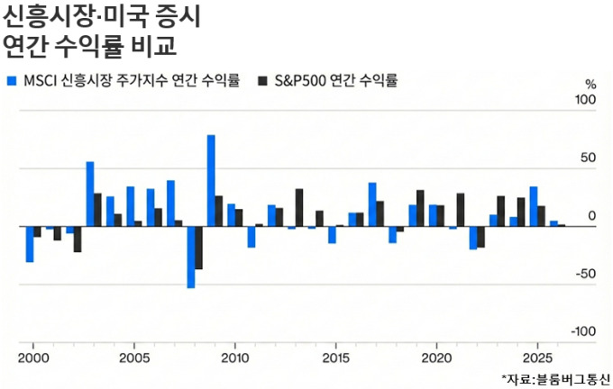 [서울=뉴스핌] 이홍규 기자 = 작년 신흥국 자산시장의 성과가 미국을 압도한 데 이어 올해도 '아웃퍼폼' 국면을 기대하는 전망이 월가에서 힘을 얻고 있다. 달러화 약세 전망, 선진국 국채시장의 불안, 원자재 강세 관측 등 5가지 조합이 맞아떨어지면서다.