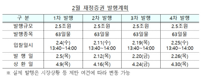 2월에는 원활한 재정집행을 지원하기 위해 10조원의 재정증권을 발행할 계획이다. 매 회계연도 내에 상환해야 하는 단기 국채인 재정증권과 한국은행 일시차입은 국회의 승인한도 40조원 내에서 활용하고 있다.
