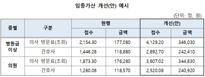 의원급의 경우 의사 방문료 임종가산액은 현행 17만6280원에서 34만4830원으로 1.96배 오른다. 간호사는 11만8570원에서 24만920원으로 2.03배 확대된다.