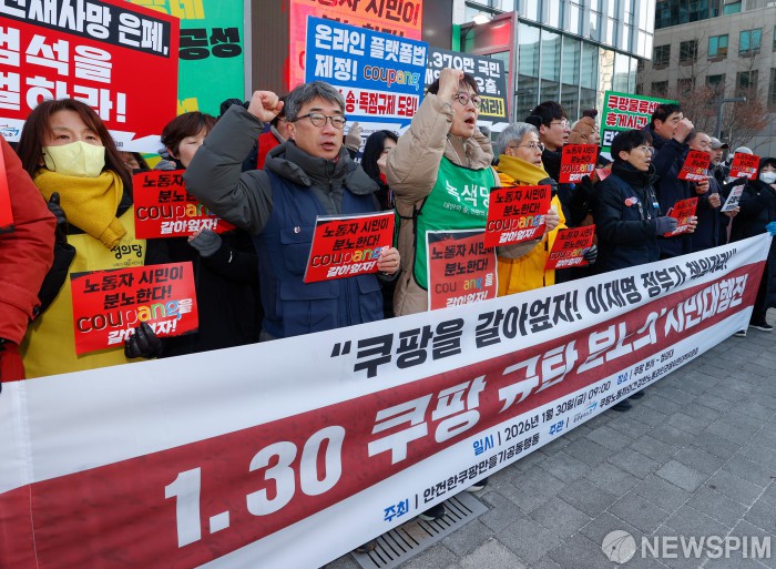 [서울=뉴스핌] 류기찬 기자 = 공공운수노조가 30일 오전 서울 송파구 쿠팡 본사 앞에서 쿠팡 규탄 분노의 시민대행진 기자회견을 열고 구호를 외치고 있다. 2026.01.30 ryuchan0925@newspim.com