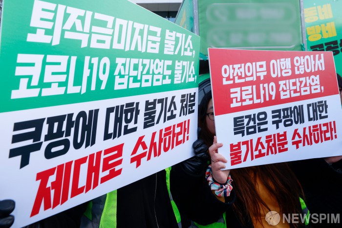[서울=뉴스핌] 류기찬 기자 = 공공운수노조가 30일 오전 서울 송파구 쿠팡 본사 앞에서 쿠팡 규탄 분노의 시민대행진 기자회견을 열고 있다. 2026.01.30 ryuchan0925@newspim.com