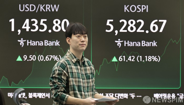 [서울=뉴스핌] 양윤모 기자 = 30일 오전 코스피가 전장 종가보다 61.42 포인트(1.18%) 상승하며 5282.67로, 코스닥은 6.07 포인트(0.52%) 하락한 1158.34로 장을 시작한 가운데, 서울 중구 하나은행본점 딜링룸에서 직원들이 업무를 보고 있다. 서울외환시장에서 달러/원 환율은 전장 대비 9.50원 상승한 1435.80원에 주간거래를 시작했다. 2026.01.30 yym58@newspim.com