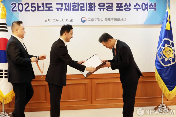 [서울=뉴스핌] 이길동 기자 = 윤창렬 국무조정실장이 30일 서울 종로구 정부서울청사에서 열린 2025년도 규제합리화 유공 포상 수여식에서 김홍목 국토교통부 모빌리티 자동차국장에게 홍조근정훈장 수여하고 있다.2026.01.30gdlee@newspim.com
