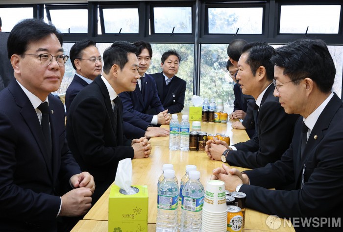 [서울=뉴스핌] 사진공동취재단 = 장동혁 국민의힘 대표(왼쪽줄 두 번째)가 30일 오후 서울 종로구 서울대학교병원 장례식장에 마련된 고(故) 이해찬 전 국무총리의 빈소에서 조문을 마친 뒤 정청래 더불어민주당 대표와 대화를 나누고 있다. 2026.01.30. photo@newspim.com
