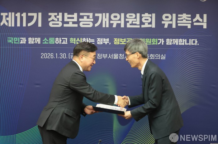 [서울=뉴스핌] 이길동 기자 =윤호중 행정안전부 장관이 30일 서울 종로구 정부서울청사에서 열린 제11기 정보공개위원회 위촉식에서 남영준 위원장에게 위촉장을 전달하고 있다.2026.01.30 gdlee@newspim.com