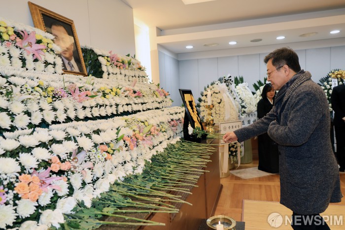 [서울=뉴스핌] 사진공동취재단 = 배우 이기영이 30일 오후 서울 종로구 서울대학교병원 장례식장에 마련된 고(故) 이해찬 전 국무총리의 빈소에서 헌화하고 있다. 2026.01.30 photo@newspim.com