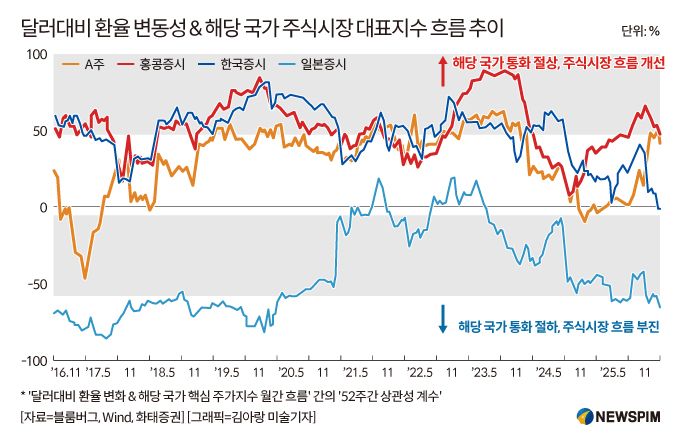 중국·홍콩과 한국의 경우 자국 통화 절상과 주가지수 성과가 대체로 양(+)의 관계였던 반면, 일본은 음(-)의 관계가 나타났다. 이를 통해 중국·한국의 수출 경쟁력은 강한 통화에서 주로 나오지 않으며, 일본은 상대적으로 그 부정적 효과가 더 크게 나타날 수 있다는 해석을 내놨다.