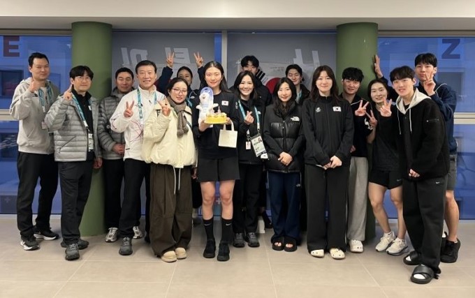 [서울=뉴스핌] 박상욱 기자 = 지난 30일 생일을 맞은 심석희를 축하하기 위해 이탈리아 밀라노 선수촌에서 모인 한국선수단 임원과 동료 선수들. [사진=대한체육회] 2026.02.01 psoq1337@newspim.com