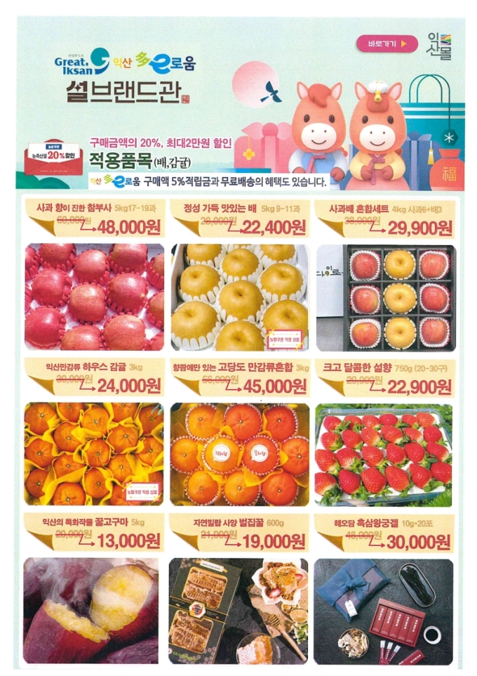 행사 기간 익산몰 회원을 대상으로 최대 20% 할인 혜택이 제공되며, 구매 금액의 5%를 포인트로 적립해 준다. 이와 함께 전국 무료배송을 지원해 설 명절 선물을 보다 편리하게 준비할 수 있도록 했다.