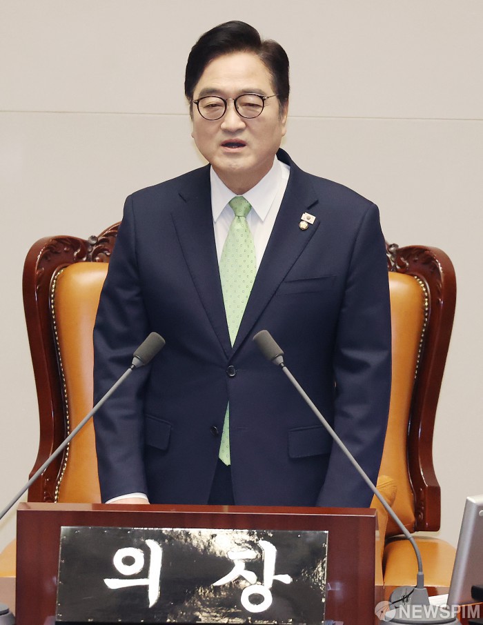 [서울=뉴스핌] 정일구 기자 = 우원식 국회의장이 2일 오후 서울 여의도 국회에서 열린 제432회 국회(임시회) 개회식에서 개회사를 하고 있다. 2026.02.02 mironj19@newspim.com