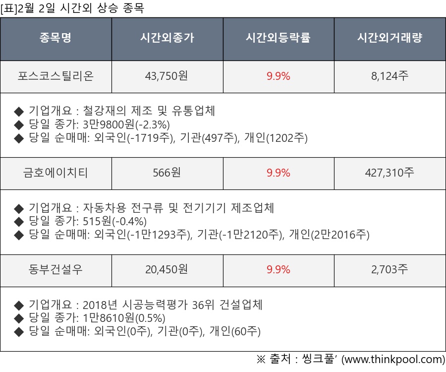 [표]2월 2일 시간외 상승 종목 및 최근 동향