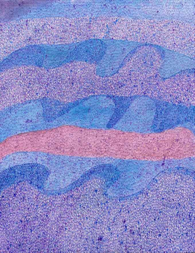 출품작 중에는 파도가 넘실대는 푸른 바다를 연상케 하는 색면화들이 여럿 포함됐다. 장엄하고 숭고미가 느껴지는 푸른 화폭이다. 또 붉디 붉은 가을 단풍숲을 보는 듯한 회화도 있다. 이들 일련의 작품은 멀리서 보면 추상적이고, 비물질적인 색면으로 읽힌다. 하지만 화폭에 가까이 다가가면 갈수록 무수한 '작은 인간들'이 층층이 쌓여 있는 것을 목도하게 된다. 놀라운 반전이다. 수천·수만의 인간 존재들이 켜켜이 탑을 이루며 하나의 거대한 풍경으로 변환하고 있는 것이다.