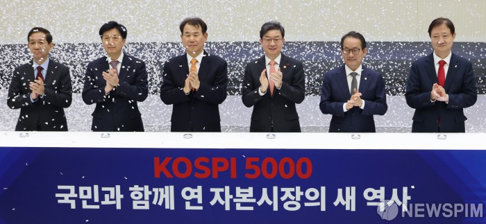 [서울=뉴스핌] 이형석 기자 = 이억원 금융위원장과 정은보 한국거래소 이사장을 비롯한 내빈들이 3일 오전 서울 여의도 한국거래소에서 열린 'KOSPI 5000 and Beyond' 세미나에서 기념촬영을 하고 있다. 2026.02.03 leehs@newspim.com