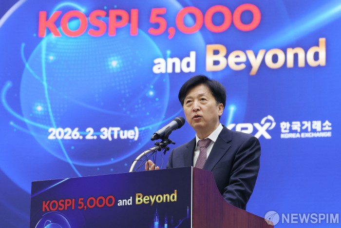 [서울=뉴스핌] 이형석 기자 = 오기형 국회 코리아 프리미엄 K-자본시장 특위 위원장이 3일 오전 서울 여의도 한국거래소에서 열린 'KOSPI 5000 and Beyond' 세미나에서 축사를 하고 있다. 2026.02.03 leehs@newspim.com