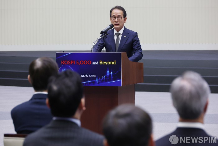 [서울=뉴스핌] 이형석 기자 = 강준현 국회 정무위원회 여당 간사가 3일 오전 서울 여의도 한국거래소에서 열린 'KOSPI 5000 and Beyond' 세미나에서 축사를 하고 있다. 2026.02.03 leehs@newspim.com