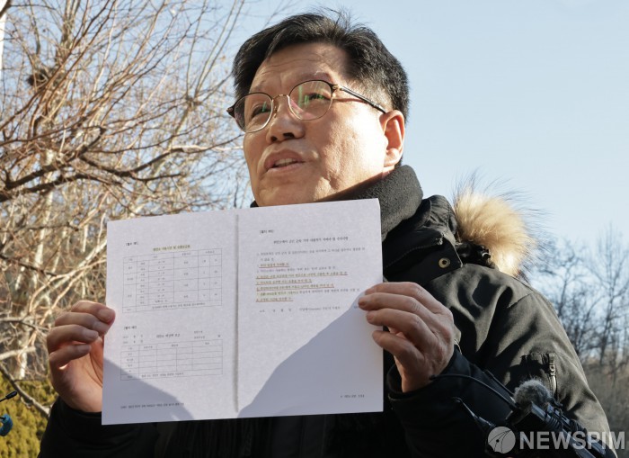 [서울=뉴스핌] 양윤모 기자 = 일본군 '위안부' 피해자를 모욕하는 시위를 벌여온 김병헌 '위안부법폐지국민행동' 대표가 3일 오전 사자명예훼손과 집회 및 시위에 관한 법률 위반 등 피의자 신분으로 서울 서초경찰서에 출석하며 성매매자료라고 보여주고 있다. 김 대표는 지난해 말부터 소녀상이 설치된 서울 서초고와 무학여고, 성동중학교 앞에서 신고되지 않은 집회를 열고 '교정에 위안부상 세워두고 매춘 진로지도 하나' 등의 문구가 적힌 현수막을 펼쳐 든 혐의를 받고 있다. 2026.02.03 yym58@newspim.com
