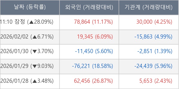 [서울=뉴스핌] 로보뉴스 = 03일 11시 30분 현재 제이에스링크(127120)는 외국인과 기관이 각각 7.89 만 주, 3.00 만 주 순매수(잠정) 하면서 전일 대비 28.09% (현재가 28,500원) 상승하고 있다.