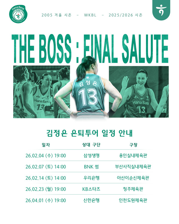 하나은행은 3일 "구단의 상징이자 한국 여자농구의 역사 그 자체인 김정은이 2025-2026시즌 잔여 일정인 5·6라운드 동안 하나은행의 마지막 원정 경기가 열리는 5개 구장에서 WKBL 최초의 은퇴 투어를 진행한다"라고 공식 발표했다.