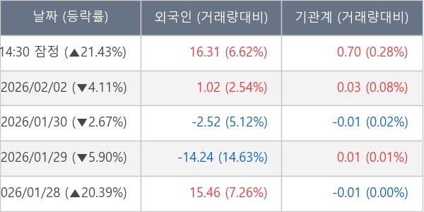 [서울=뉴스핌] 로보뉴스 = 03일 14시 35분 현재 TPC(048770)는 외국인과 기관이 각각 16.31 만 주, 0.70 만 주 순매수(잠정) 하면서 전일 대비 21.43% (현재가 4,250원) 상승하고 있다.