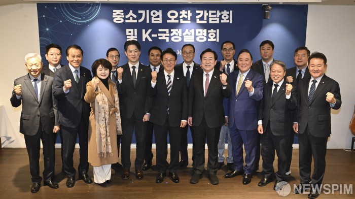 [서울=뉴스핌] 이길동 기자 =김민석 국무총리와 김기문 중소기업중앙회장을 비롯한 참석자들이 3일 서울 중구 달개비에서 열린 중소기업 오찬 간담회 및 K-국정설명회에서 기념 촬영을 하고 있다. 앞줄 왼쪽 4번째부터 노용석 중소벤처기업부 제1차관, 김 총리, 김 회장. 2026.2.3 2026.02.03 gdlee@newspim.com