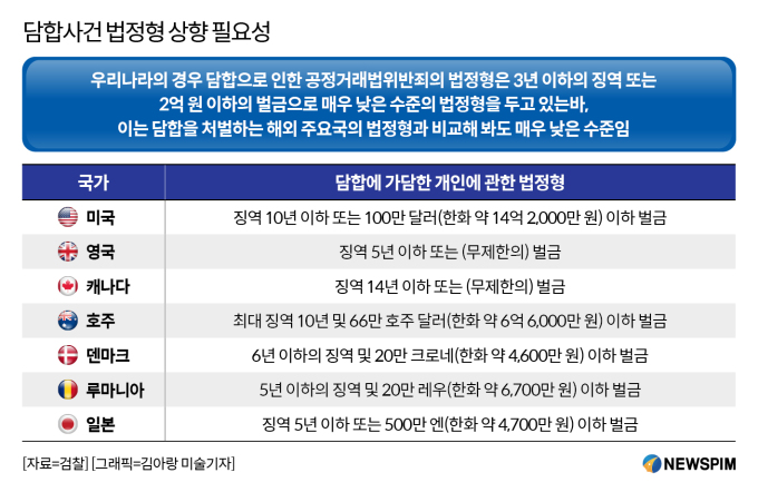 해외 주요국과 비교하면 한국의 법정형은 분명 낮은 편이다. 미국은 담합에 가담한 법인뿐 아니라 개인에게도 최대 징역 10년 또는 100만 달러(약 14억 2000만 원) 이하 벌금을 부과할 수 있도록 하고 있다. 영국은 징역 5년 이하 또는 상한 없는 벌금을 규정하고 있고, 캐나다는 징역 14년 이하 또는 무제한 벌금을 허용한다. 호주는 최대 징역 10년에 66만 호주달러(약 6억 6000만 원) 벌금을 부과할 수 있도록 했다. 덴마크·루마니아·일본 등도 우리보다 형량이 전반적으로 높다.