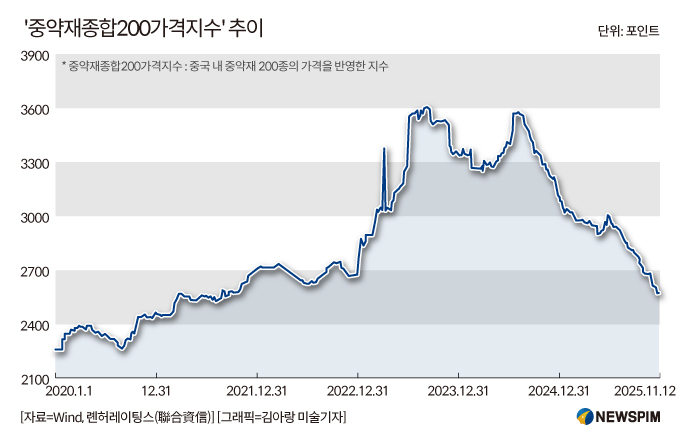 중국 대표 신용평가기관 중 하나인 롄허레이팅스(聯合資信∙LianheRatings)가 중국 금융정보 제공업체 윈드(Wind) 데이터에 기반해 공개한 최신 자료에 따르면 '중약재종합200가격지수(中藥材綜合200價格指數)'는 해당 정책이 공식적으로 발표된 2023년 9월에 한 차례 가격이 꺾인 이후, 정식으로 시행된 2024년 8월 이후 급격한 하락세를 지속하고 있다.