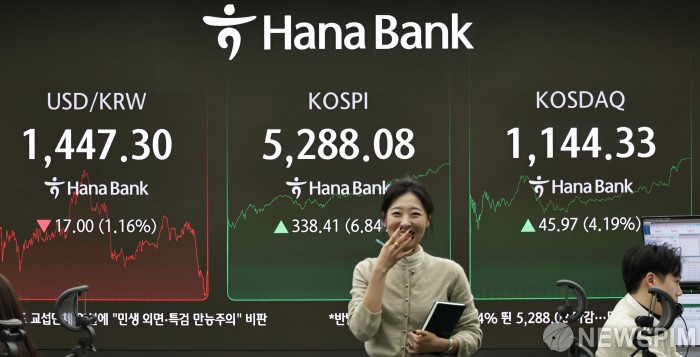 [서울=뉴스핌] 양윤모 기자 = 3일 오후 외국인과 기관의 매수속에 코스피가 전장 종가보다 338.41 포인트(6.84%) 상승하며 5228.08로, 코스닥은 45.97 포인트(4.19%) 상승한 1144.33으로 장을 마감한 가운데, 서울 중구 하나은행본점 딜링룸에서 직원들이 업무를 보고 있다. 서울외환시장에서 달러/원 환율은 전장 대비 17.00원 하락한 1447.30원에 주간거래를 마감했다. 2026.02.03 yym58@newspim.com