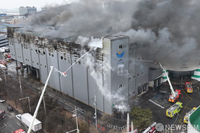 [시흥=뉴스핌] 류기찬 기자 = 3일 오후 경기 시흥시 정왕동 SPC삼립 시화공장에서 화재가 발생해 소방대원들이 진화 작업을 벌이고 있다. 소방당국은 대응 1단계를 발령하고 펌프차 등 장비와 인력을 투입해 불길을 잡고 있다. 2026.02.03 ryuchan0925@newspim.com