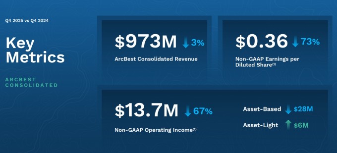 아크베스트의 핵심인 자산 기반 LTL 부문은 물동량 증가에도 불구하고 마진 압박이 심화됐다. 4분기 일일 운송 건수는 전년 대비 2.4% 증가했고, 톤수는 2.6% 늘었다. 1월에는 이 추세가 더욱 강화돼 일일 운송 건수가 3%, 톤수는 8% 증가했다.