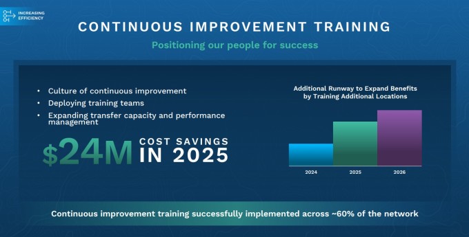 지속적 개선 프로그램도 성과를 냈다. 현재 네트워크의 약 60% 시설에 도입된 이 프로그램을 통해 2025년 연간 2400만 달러의 비용 절감을 실현했다. 도시 노선 최적화 프로젝트는 2025년에만 200만 달러를 절감했고, 연간 총 절감액은 1500만 달러에 달했다.