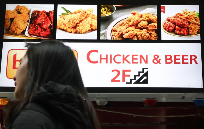 [서울=뉴스핌] 최지환 기자 = 정부가 상위 10대 치킨 프랜차이즈를 대상으로 매장 및 배달 주문 메뉴판에 조리 전 닭고기 무게를 고지해야 되는 '치킨 중량표시제'를 실시한 15일 서울 시내의 한 치킨매장 앞으로 시민들이 오가고 있다. 2025.12.15 choipix16@newspim.com