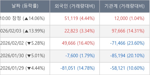 [서울=뉴스핌] 로보뉴스 = 04일 10시 15분 현재 롯데에너지머티리얼즈(020150)는 외국인과 기관이 각각 5.11 만 주, 1.20 만 주 순매수(잠정) 하면서 전일 대비 14.06% (현재가 47,850원) 상승하고 있다.