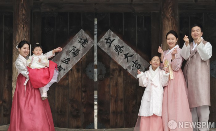 [서울=뉴스핌] 양윤모 기자 = 봄의 시작을 알리는 입춘(立春)을 맞아 4일 오전 서울 중구 남산골한옥마을이 '2026 세시절기 입춘(立春)' 행사를 진행했다. 행사는 지난 2016년 남산골한옥마을에서 전통혼례를 올린 가족과 웨딩사진을 촬영한 부부가 ‘입춘대길(立春大吉) 건양다경(建陽多慶)’ 등의 글귀를 대문에 써 붙이는 입춘첩 시연에 참여했다.2026.02.04 yym58@newspim.com