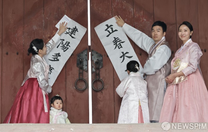 [서울=뉴스핌] 양윤모 기자 = 봄의 시작을 알리는 입춘(立春)을 맞아 4일 오전 서울 중구 남산골한옥마을이 '2026 세시절기 입춘(立春)' 행사를 진행했다. 행사는 지난 2016년 남산골한옥마을에서 전통혼례를 올린 가족과 웨딩사진을 촬영한 부부가 ‘입춘대길(立春大吉) 건양다경(建陽多慶)’ 등의 글귀를 대문에 써 붙이는 입춘첩 시연에 참여했다. 2026.02.04 yym58@newspim.com
