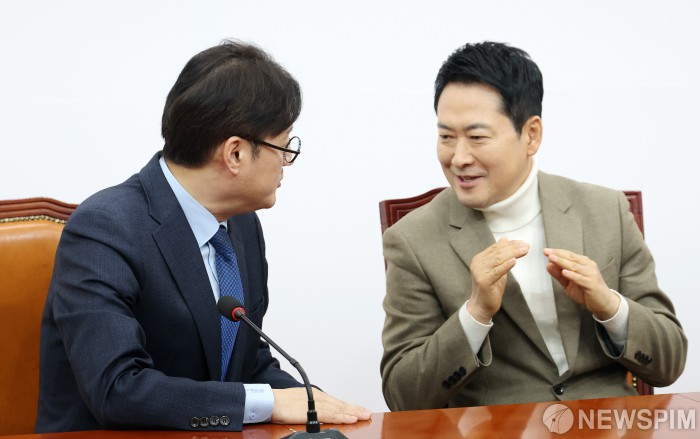 [서울=뉴스핌] 정일구 기자 = 장동혁 국민의힘 대표가 5일 오전 서울 여의도 국회에서 홍익표 청와대 정무수석을 접견하며 대화하고 있다. 2026.02.05 mironj19@newspim.com