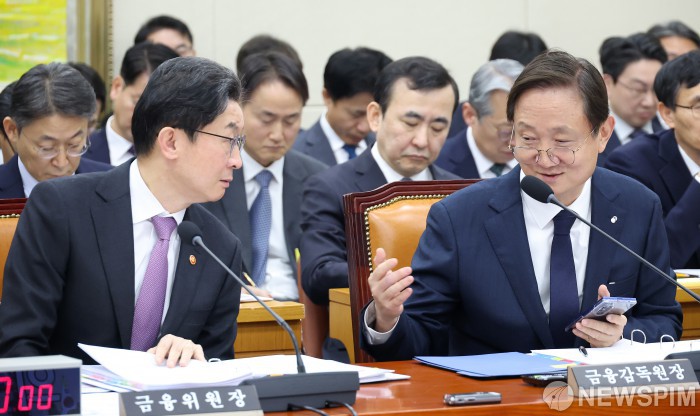 [서울=뉴스핌] 정일구 기자 = 이억원 금융위원장과 이찬진 금융감독원장이 5일 오전 서울 여의도 국회에서 열린 정무위원회 제1차 전체회의에서 대화를 나누고 있다. 2026.02.05 mironj19@newspim.com
