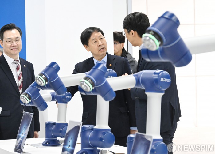 [서울=뉴스핌] 구윤철 부총리 겸 재정경제부 장관이 5일 인천광역시 소재 혁신기업 현장으로 로봇 솔수션 설계 및 로봇 표준화 플렛폼 구축 기업인 브릴스를 방문, 전 진 대표이사로부터 제품설명과 생산공정 설명을 듣고 있다.[사진= 재정경제부 ] 2026.02.05 photo@newspim.com