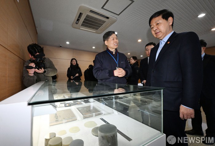 [서울=뉴스핌] 구윤철 부총리 겸 재정경제부 장관이 5일 인천광역시 소재 혁신기업 현장으로 압전단결정 소재 및 수중음향센서를 생산하는 아이블포토닉스를 방문, 이상구 대표이사로부터 제품설명과 생산공정 설명을 듣고 있다.[사진= 재정경제부 ] 2026.02.05 photo@newspim.com