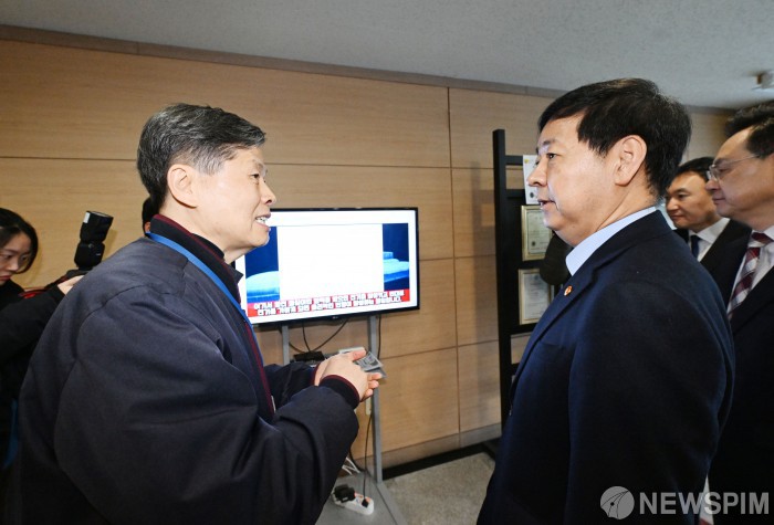 [서울=뉴스핌] 구윤철 부총리 겸 재정경제부 장관이 5일 인천광역시 소재 혁신기업 현장으로 압전단결정 소재 및 수중음향센서를 생산하는 아이블포토닉스를 방문, 이상구 대표이사로부터 제품설명과 생산공정 설명을 듣고 있다.[사진= 재정경제부 ] 2026.02.05 photo@newspim.com