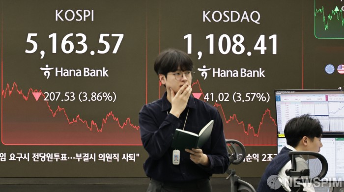 [서울=뉴스핌] 양윤모 기자 = 인공지능(AI) 관련 주식의 고평가 논란속 뉴욕증시가 혼조 마감한 5일 오후 코스피가 전장 종가보다 207.53 포인트(3.86%) 하락하며 5163.57로, 코스닥은 41.02 포인트(3.57%) 하락한 1108.41 로 거래를 마감한 가운데, 서울 중구 하나은행본점 딜링룸에서 직원들이 업무를 보고 있다. 서울외환시장에서 달러/원 환율은 전장 대비 17.50원 상승한 1467.70원에 주간거래를 마감했다. 2026.02.05 yym58@newspim.com