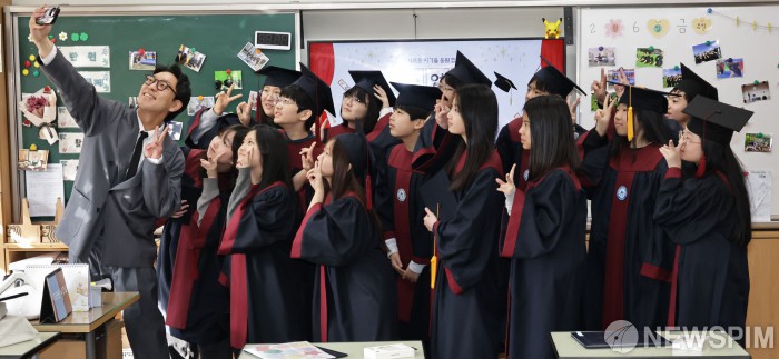 [서울=뉴스핌] 양윤모 기자 = 6일 오전 서울 은평구 서울신도초등학교(학교장 김재영)에서 열린 제93회 졸업식에서 학생들이 담임 선생님과 셀카를 촬영하며 졸업을 축하하고 있다. 2026.02.06 yym58@newspim.com