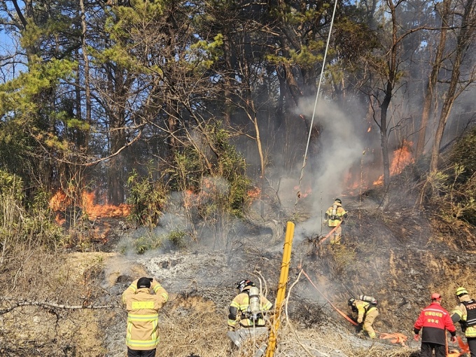 '야산에 불꽃과 흰 연기가 발생한다'는 신고를 받은 경북소방은 진화 헬기 3대와 119산불특수대응단, 산불신속대응팀 등 진화 인력과 장비를 급파해 마을로의 연소 확산 차단 등 조기 진화에 주력하고 있다.