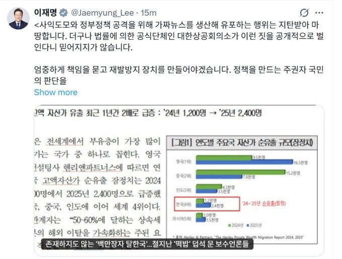 이 대통령은 7일 소셜미디어 X(옛 트위터)에 최근 대한상의가 배포한 '백만장자 탈한국' 자료가 신빙성이 떨어지는 엉터리 자료라는 내용의 언론보도를 인용하면서 이같이 말했다.
