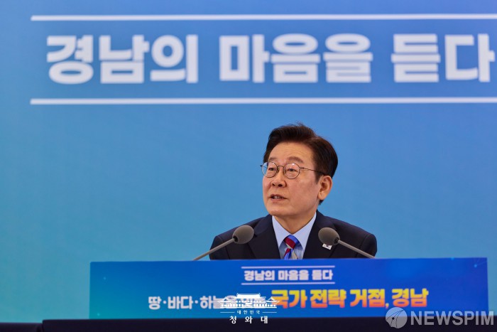 [서울=뉴스핌] 이재명 대통령이 지난 6일 창원 성산구 창원컨벤션센터에서 열린 '경남의 마음을 듣다' 타운홀미팅 간담회에서 발언을 하고 있다. [사진=청와대] 2026.02.07 photo@newspim.com