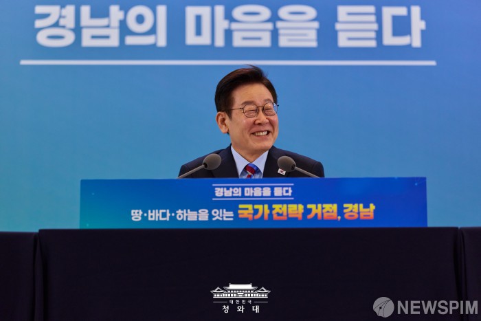 [서울=뉴스핌] 이재명 대통령이 지난 6일 창원 성산구 창원컨벤션센터에서 열린 '경남의 마음을 듣다' 타운홀미팅 간담회에서 미소를 짓고 있다. [사진=청와대] 2026.02.07 photo@newspim.com