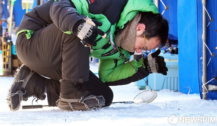 [서울=뉴스핌] 휴일인 8일 오후 강추위에도 불구하고 강원도 평창군 진부면 오대천 일원에 열린 '평창송어축제'를 찾은 방문객이 얼음낚시에 집중하고 있다. 9일 폐막하는 올해 축제는 축제조직위원회에 따르면 기간 동안 모두 25만 여명이 방문, 22억 여 원의 매출을 올린 것으로 나타났다. [사진=평창관광문화재단] 2026.02.08 photo@newspim.com