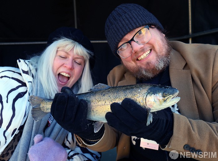 [서울=뉴스핌] 휴일인 8일 오후 강추위에도 불구하고 강원도 평창군 진부면 오대천 일원에 열린 '평창송어축제'를 찾은 외국인 방문객이 잡은 송어를 들어 보이고 있다. 9일 폐막하는 올해 축제는 축제조직위원회에 따르면 기간 동안 모두 25만 여명이 방문, 22억 여 원의 매출을 올린 것으로 나타났다. [사진=평창관광문화재단] 2026.02.08 photo@newspim.com